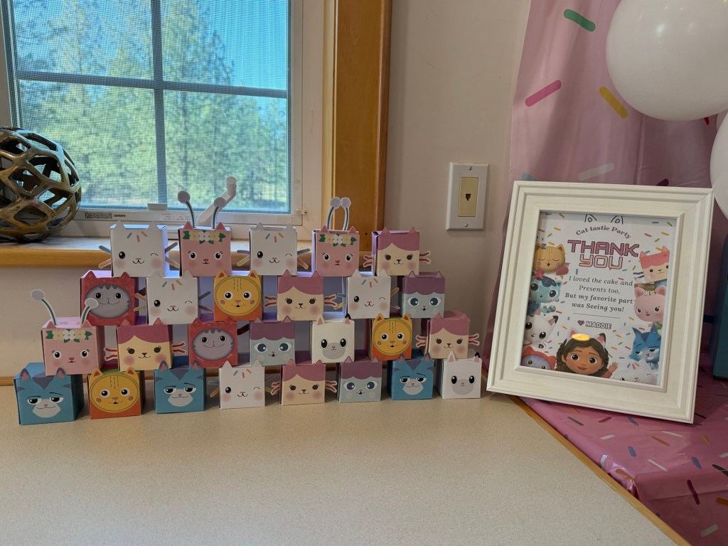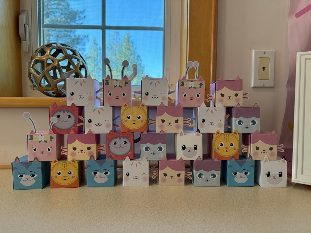 Instead of traditional goodie bags, I made little Gabby character boxes for each of the kids. I wanted something that felt on-theme but also simple — something they would actually use instead of toss aside the next day.