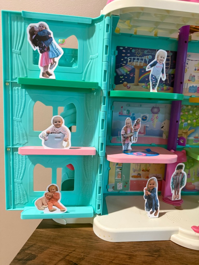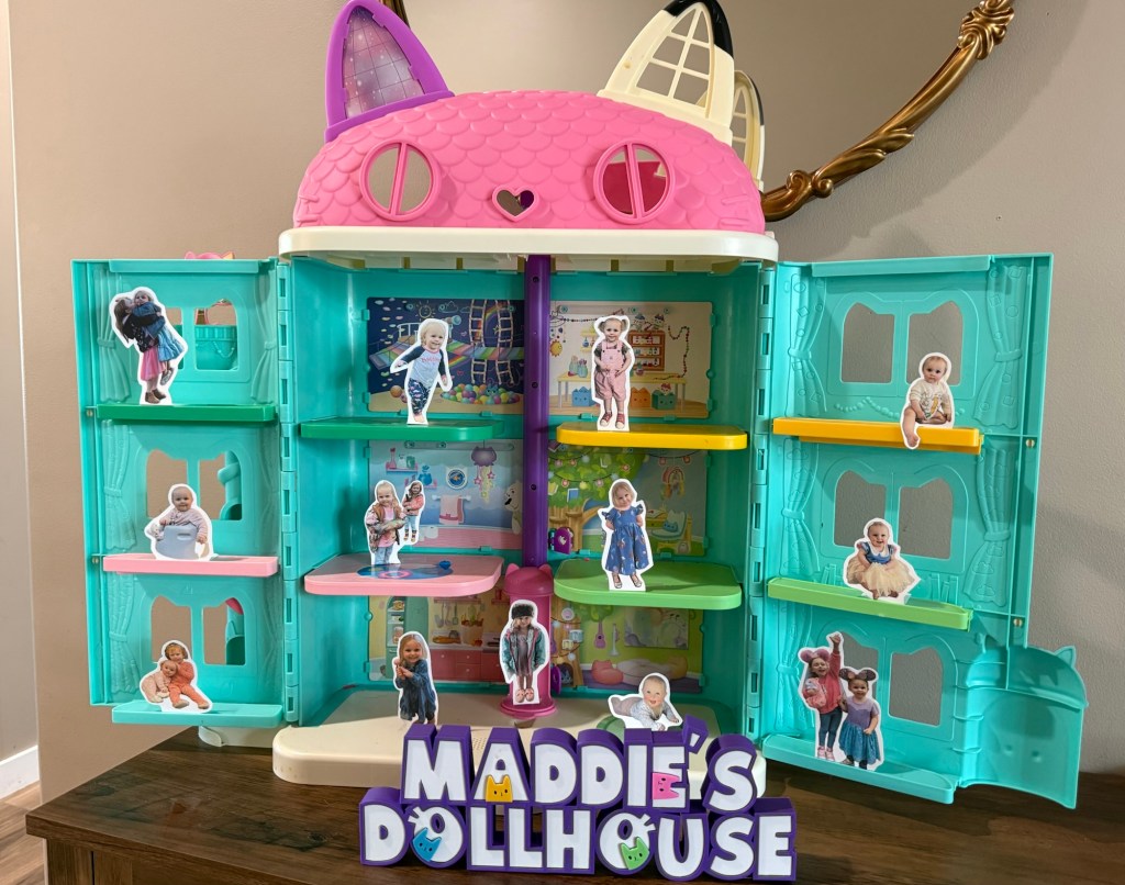 While I was cleaning out the toy room, I had the idea to repurpose her dollhouse instead of buying more decorations—and it turned out SO cute. I simply printed out small photos of my daughter, cut them out and folded a little piece on the bottom and taped them inside the dollhouse to make the little “Maddie’s” stand up. It felt personalized and interactive. The kids were obsessed with it and kept going back to look at all the pictures!