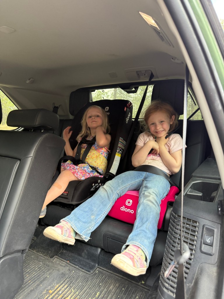 We moved our 6-year-old into a backless booster to make our car configuration even easier. Our exact booster (a slim Diono Connect3 RXT) isn’t available right now, but the whole idea was choosing a seat with a smaller footprint so we could keep access to the third row and still fit seats across the middle row.