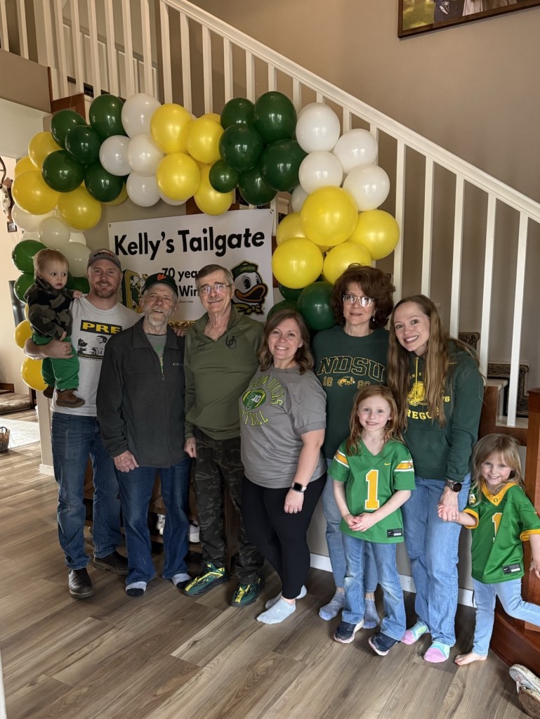 To really lean into the tailgate theme, we asked everyone to come dressed in their favorite game day gear. Most guests wore Oregon Ducks apparel or stuck to green and yellow to match the team colors. We also had a few people representing NDSU, where my dad went to undergrad, which made it even more special. It was so fun seeing everyone show up in their team gear and it instantly made the whole party feel like a real tailgate celebration.
