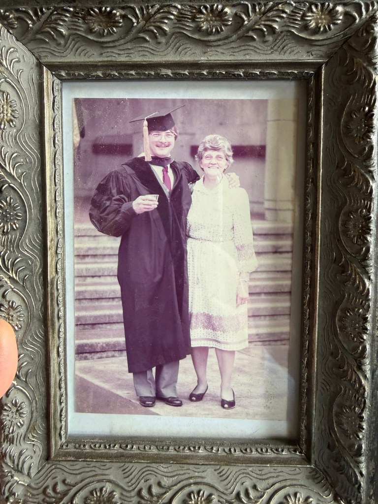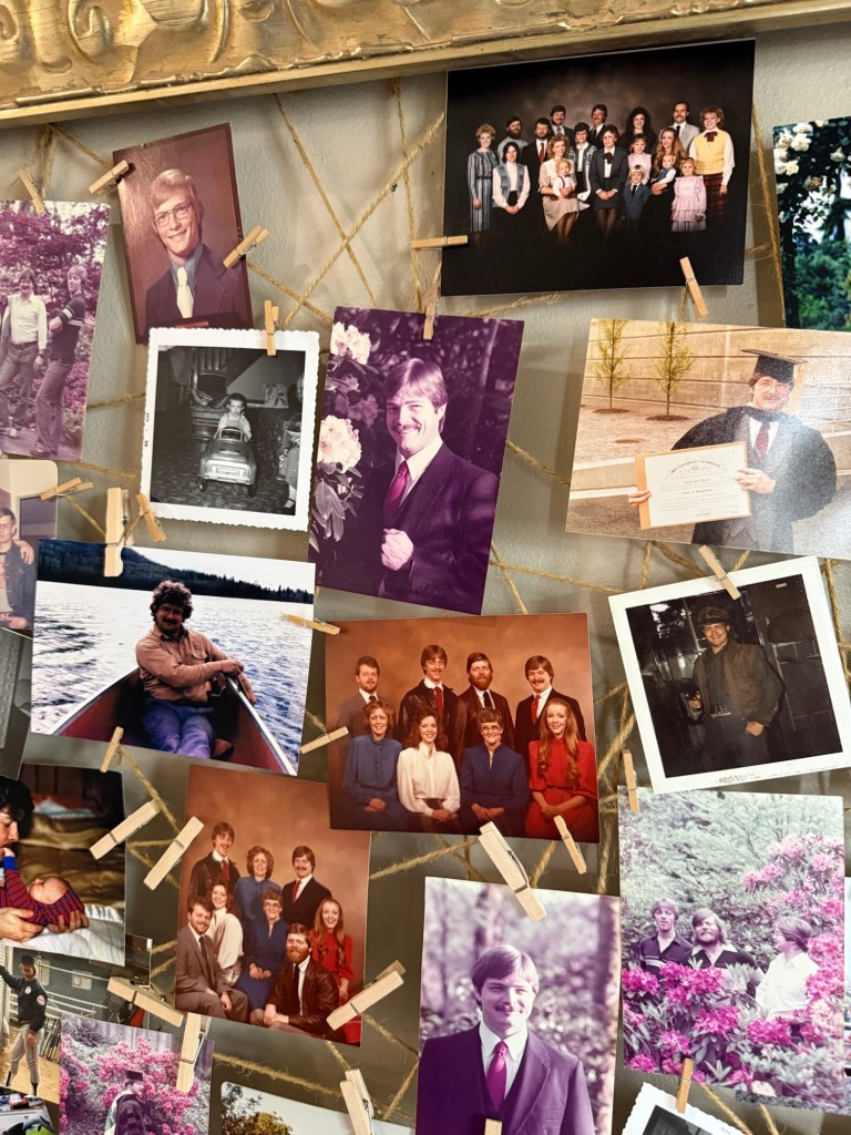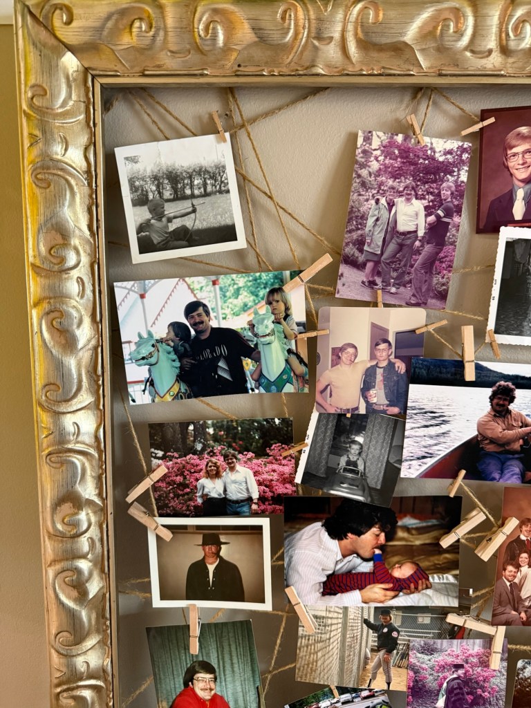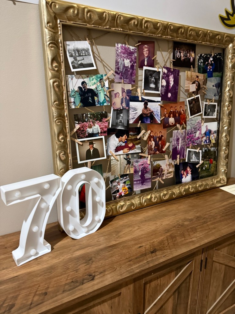 One of the most meaningful parts of the party was the memory corner. I gathered old photos of my dad from throughout his life—pictures from his childhood, his years serving in the Marine Corps, and some of my favorites of him as a young dad. To display them, I used a large gold frame and stapled string across the back to create simple lines for hanging the photos. Then I clipped the pictures onto the string with mini clothespins. It turned into such a special visual timeline of his life, and guests loved stopping by to look through the memories and share stories. I even found my dad’s old law school commencement brochure to add to the display table.