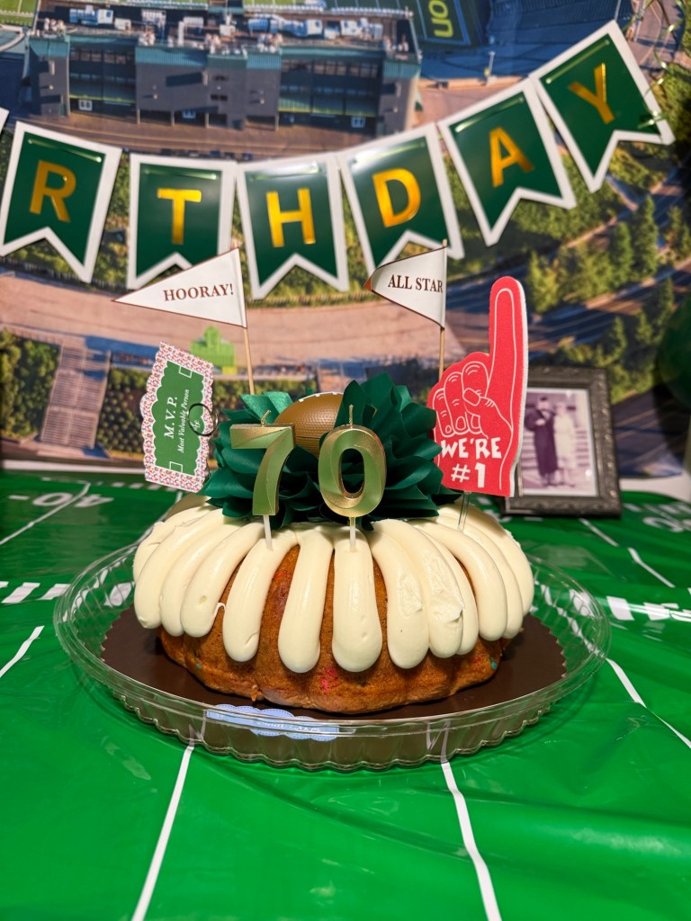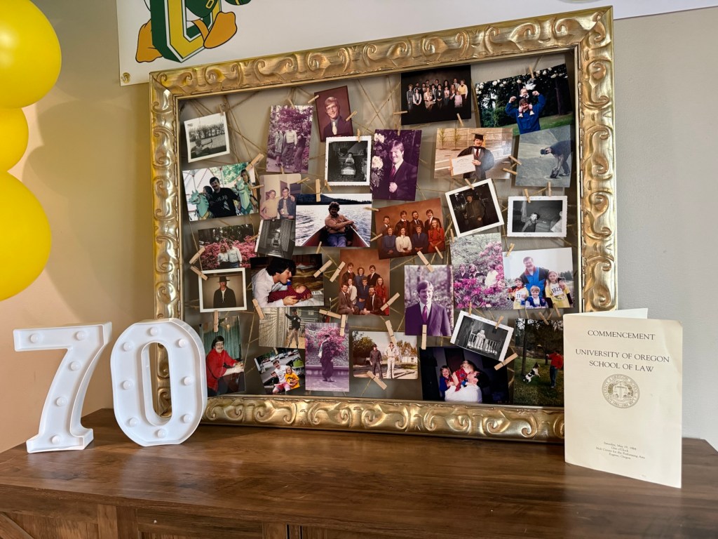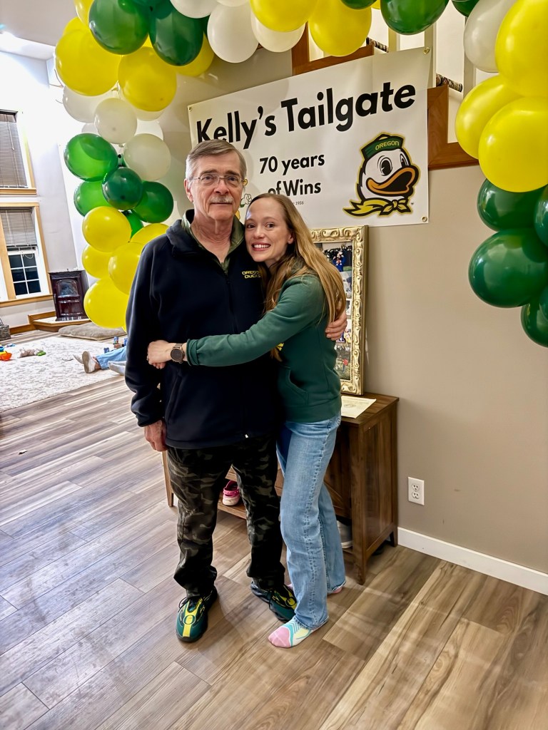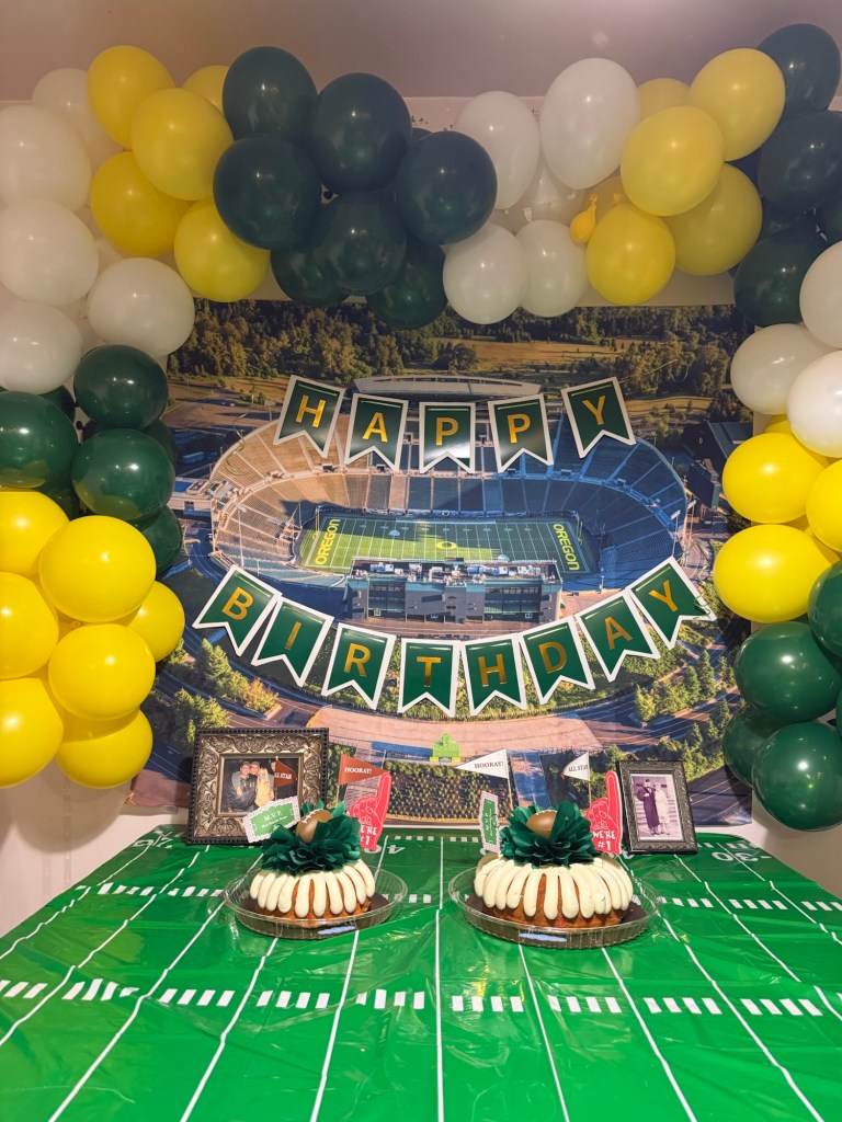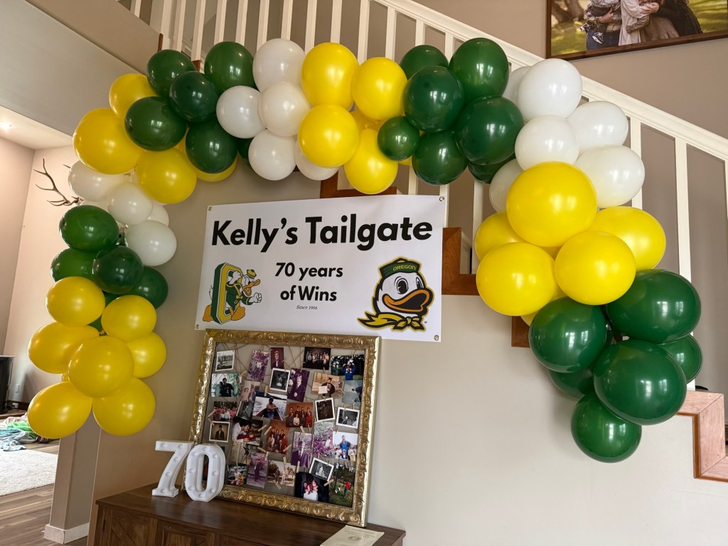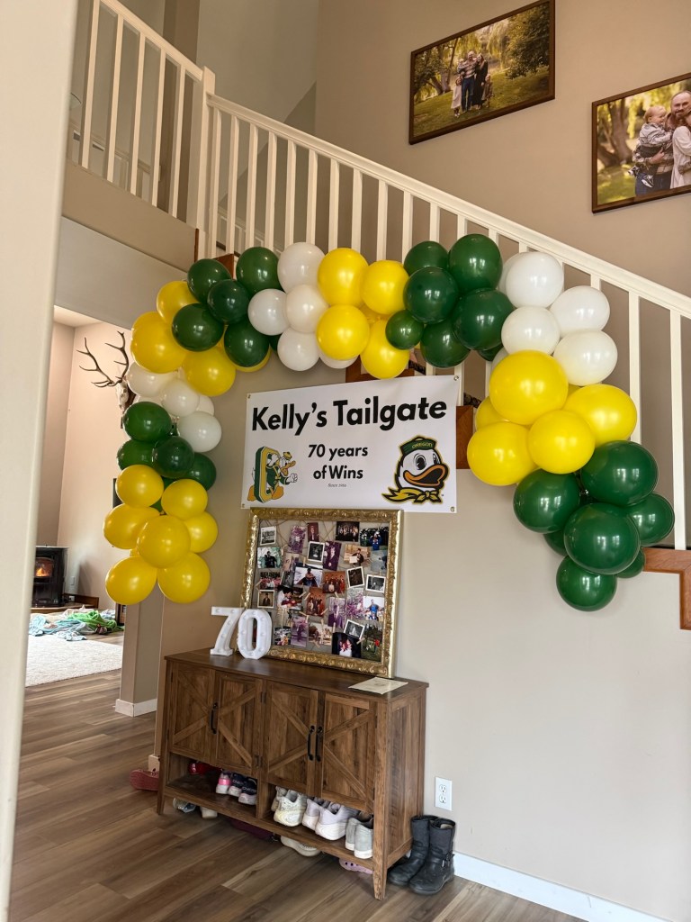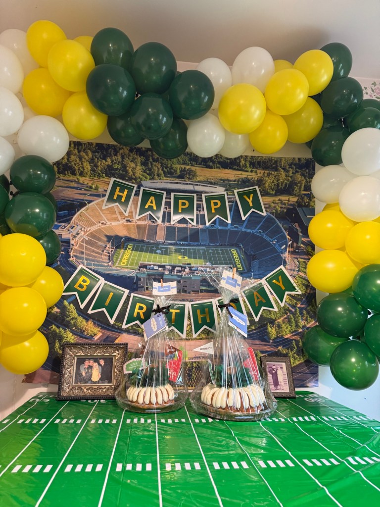When it came time to celebrate my dad turning 70, I knew the theme had to be something meaningful to him. My dad graduated from law school at the University of Oregon and has been a lifelong Ducks fan ever since. Growing up, some of my favorite memories were spending fall Saturdays together at Autzen Stadium cheering on the Ducks with our season tickets. Those games became such a special tradition for our family. So when we planned his birthday party, it only felt right to bring a little bit of that Duck spirit to the celebration! In this post, I’m sharing how we created a fun University of Oregon–inspired 70th birthday party to celebrate an incredible dad, devoted Ducks fan, and a lawyer who has spent his career helping so many people.