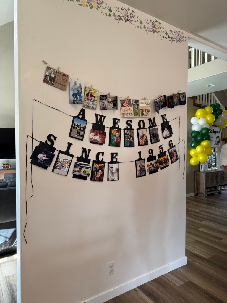 For the decor, I wanted the party to feel like a fun game day tailgate. We created a festive focal point with a green and yellow balloon arch that brought in the Oregon Ducks colors and made the space feel instantly celebratory. I also added a custom “Kelly’s Tailgate” sign to tie into the football theme and make the setup feel like an official tailgate party. Above the cake table, we hung a “Happy Birthday” banner over a large print of Autzen Stadium, which felt like the perfect tribute to all the memories our family has cheering on the Ducks together. It ended up being such a fun way to combine his love for Oregon football with celebrating his big milestone birthday.