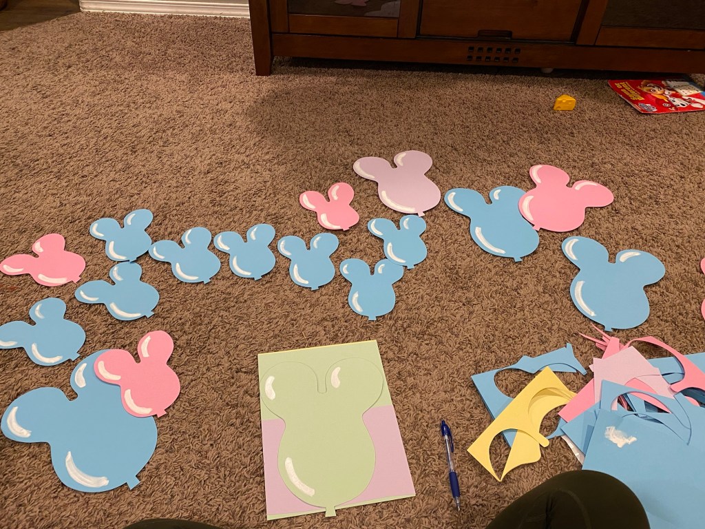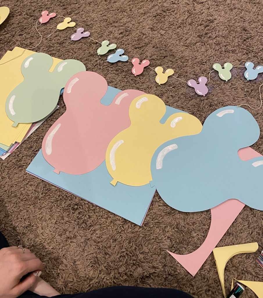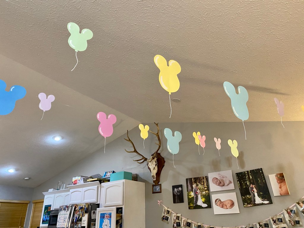 Instead of using real balloons, I hand drew Mickey-shaped balloons, cut them out, and attached them to fishing line. Then I strung the fishing line across the room, which created the illusion that the balloons were floating in the air.