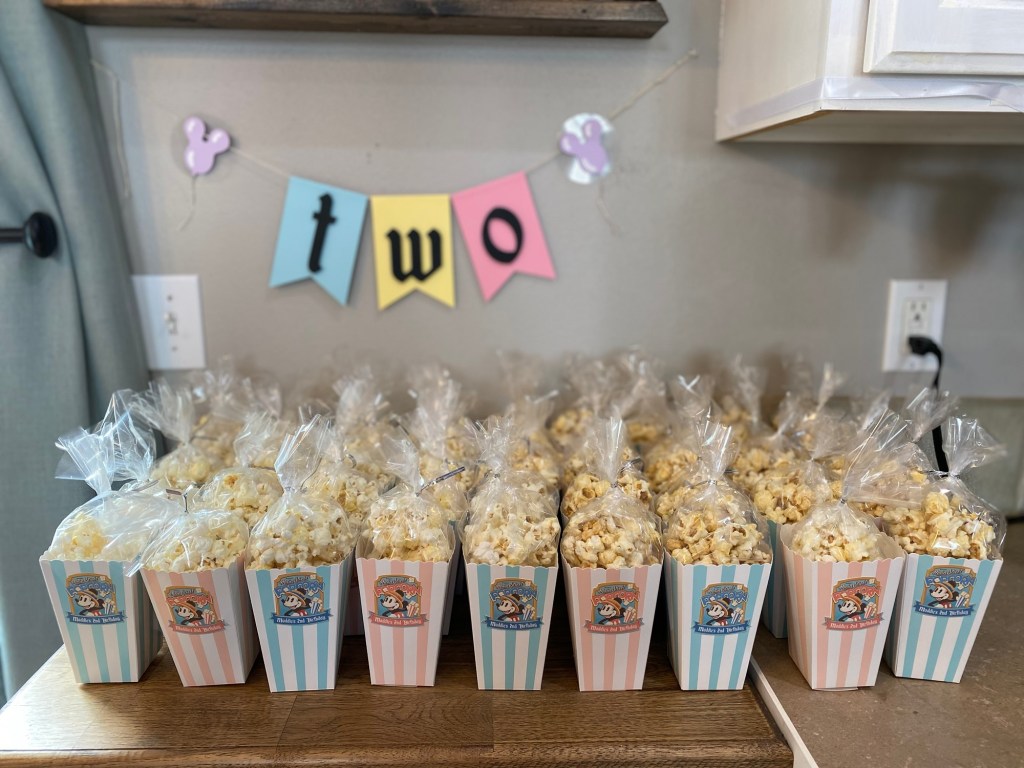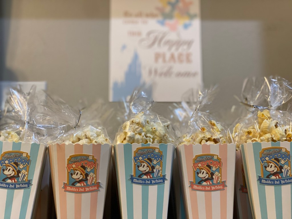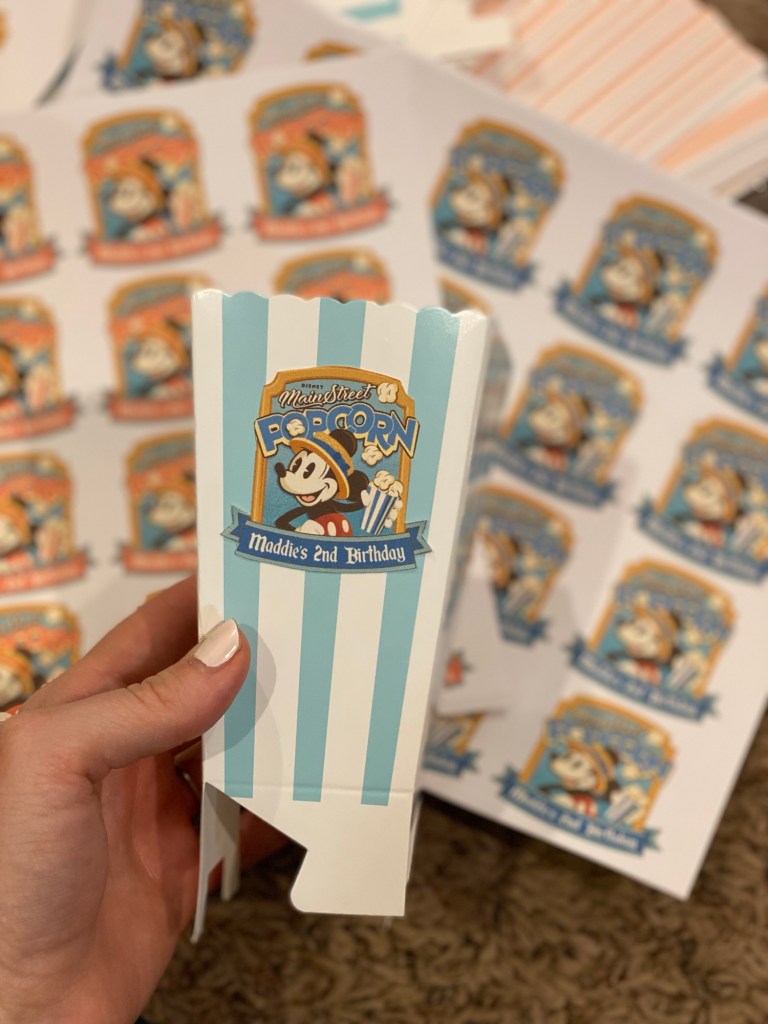 I made custom Main Street-style popcorn boxes and filled them with bagged popcorn for easy grab-and-go snacks.