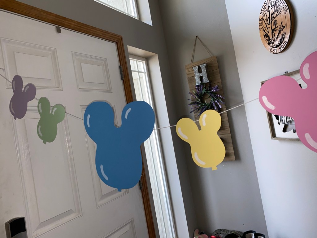 We hung a pastel “Happy Birthday” banner across the entryway and layered it with our mini balloon garland above for that soft, whimsical Disney feel.