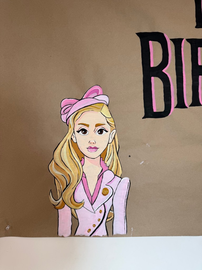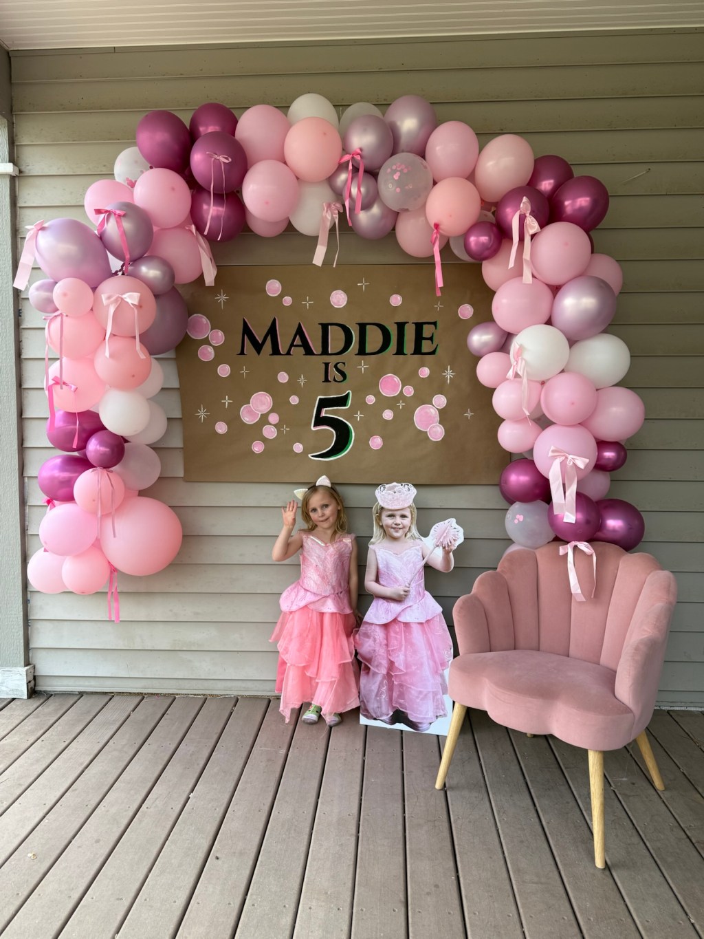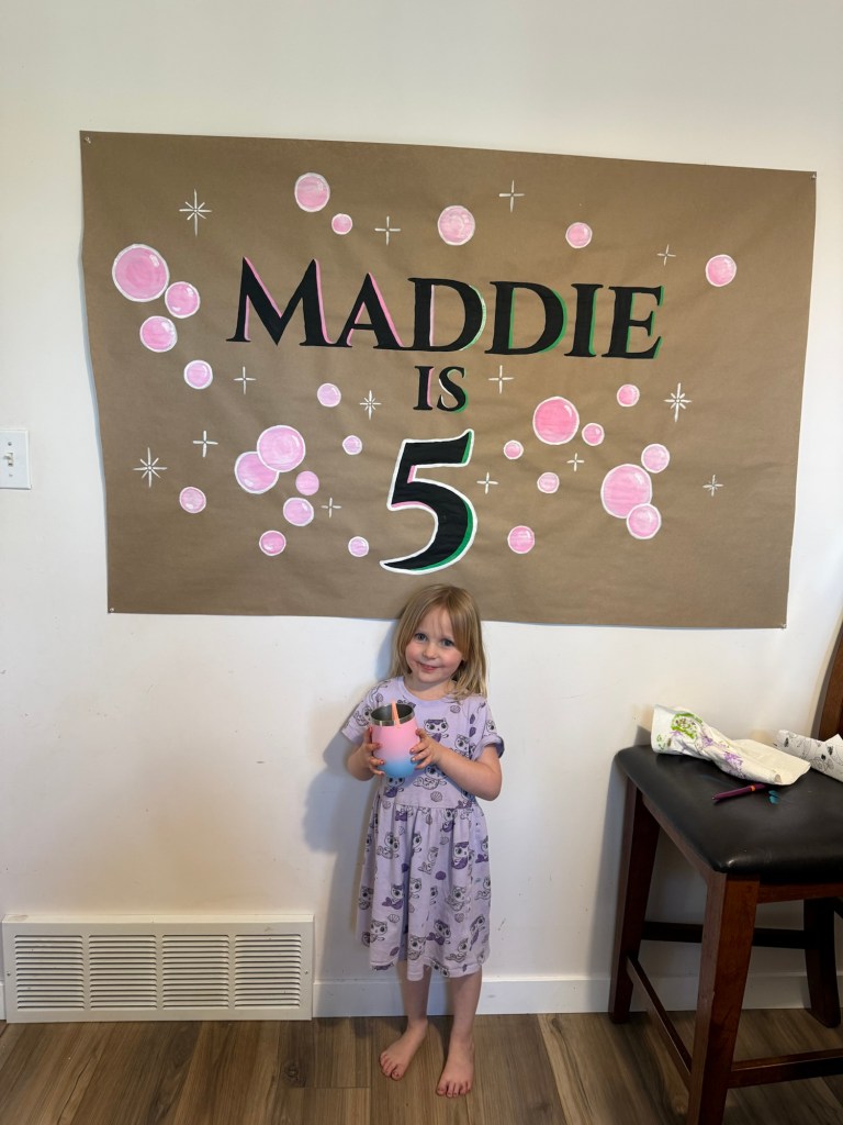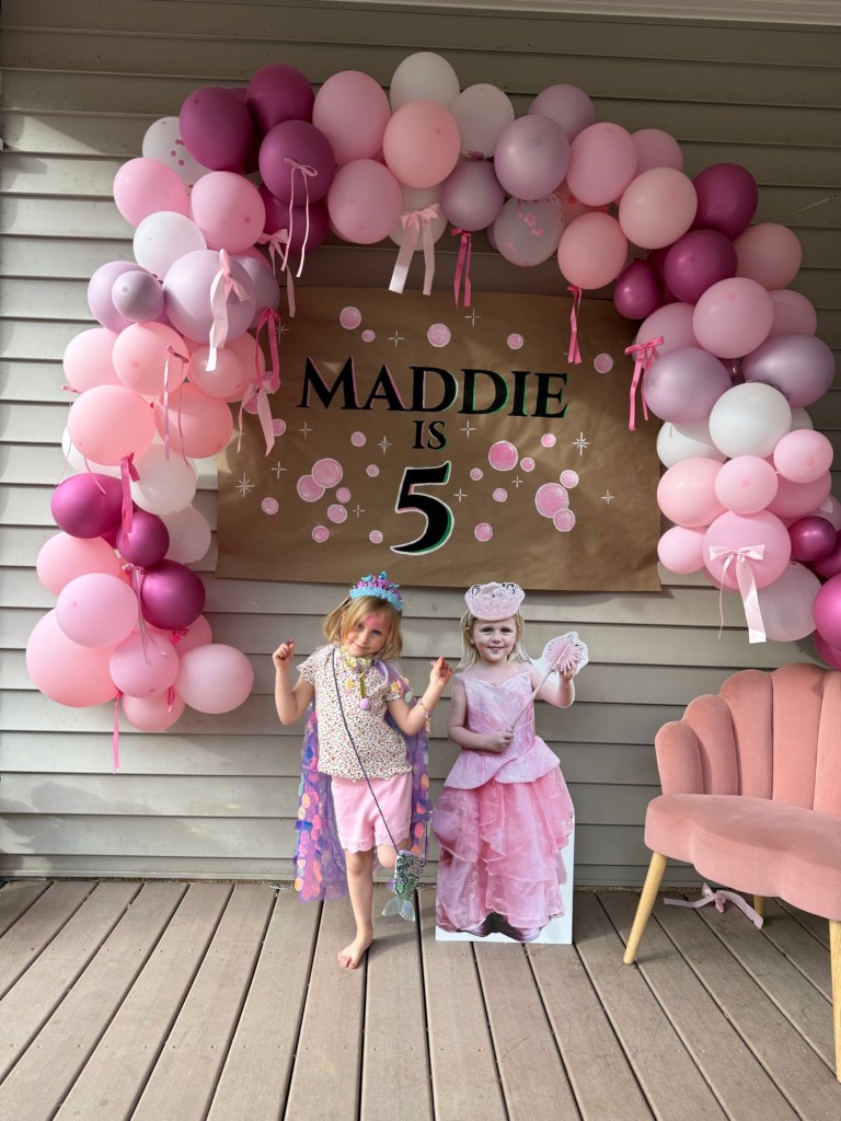 We created the main party backdrop using kraft paper (hello, budget-friendly!) and hand-painted details to bring it to life. The “Maddie is 5” sign with floating pink bubbles and sparkles set the tone for the whole party, complete with a cardboard cut out of our birthday girl!