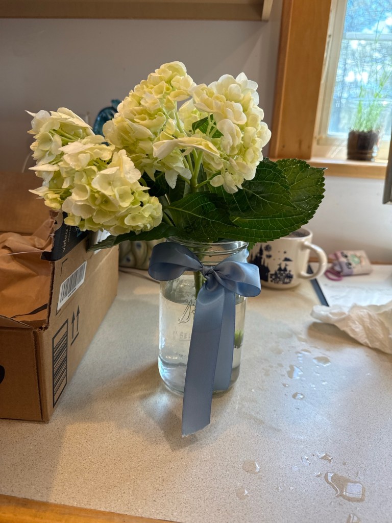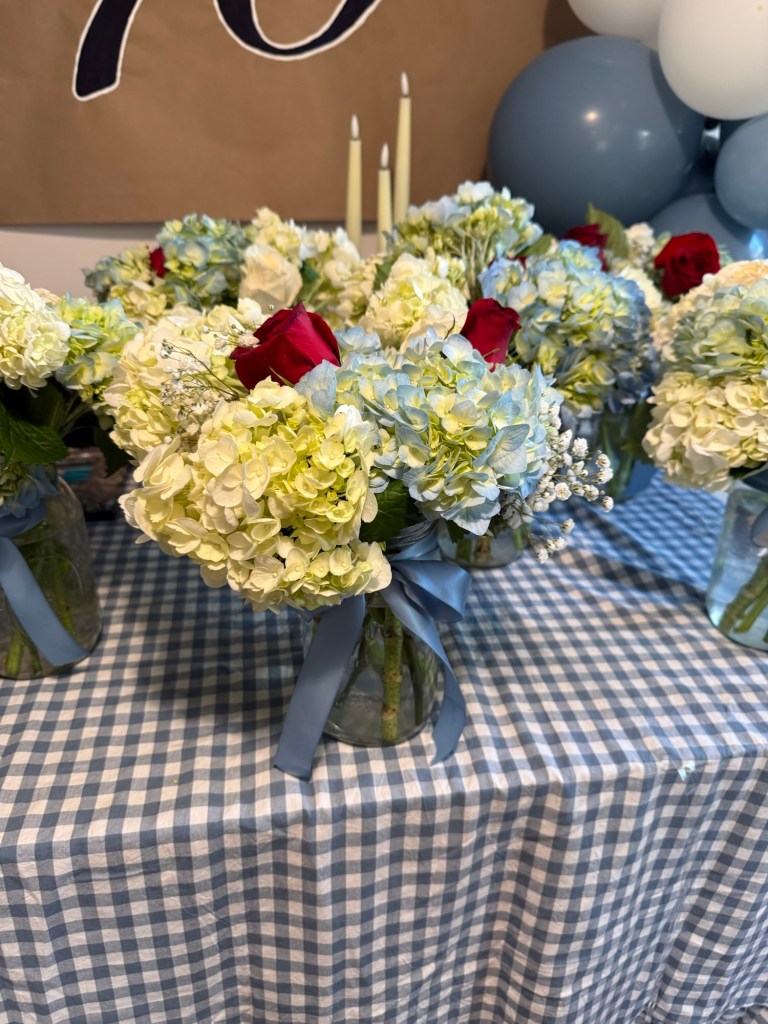 I used mason jars tied with a soft blue ribbon and filled them with a mix of white and blue hydrangeas, baby’s breath, and a few red roses. The red added the perfect little pop of color—just enough to subtly nod to Dorothy’s ruby slippers without feeling overdone.