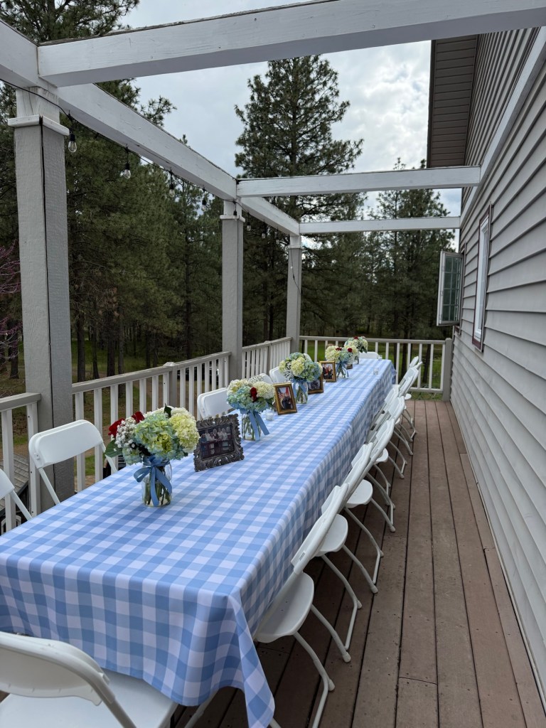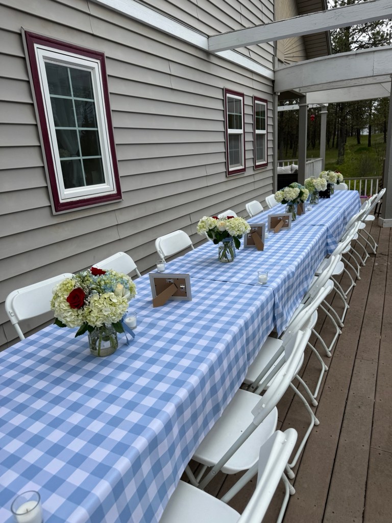 I leaned into soft blues, whites, and delicate florals to create a classic, backyard dinner feel. The blue gingham was my quiet nod to Dorothy’s dress, while small touches of red roses added just a hint of “ruby slippers” without being too on-the-nose or cheesy.